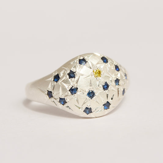 Adele is an old fashioned, apprenticeship trained, specialised gemstone setter, which involves engineering of sorts; the gemstones have to be held in the ring by moving the metal over the edges of the gems. She has been professionally setting gemstones for over 20 years, delving deep into the art. Adele's unique approach is working with the spaces left behind as much as the coloured gemstones themselves, bringing forth innovative designs never been seen before.